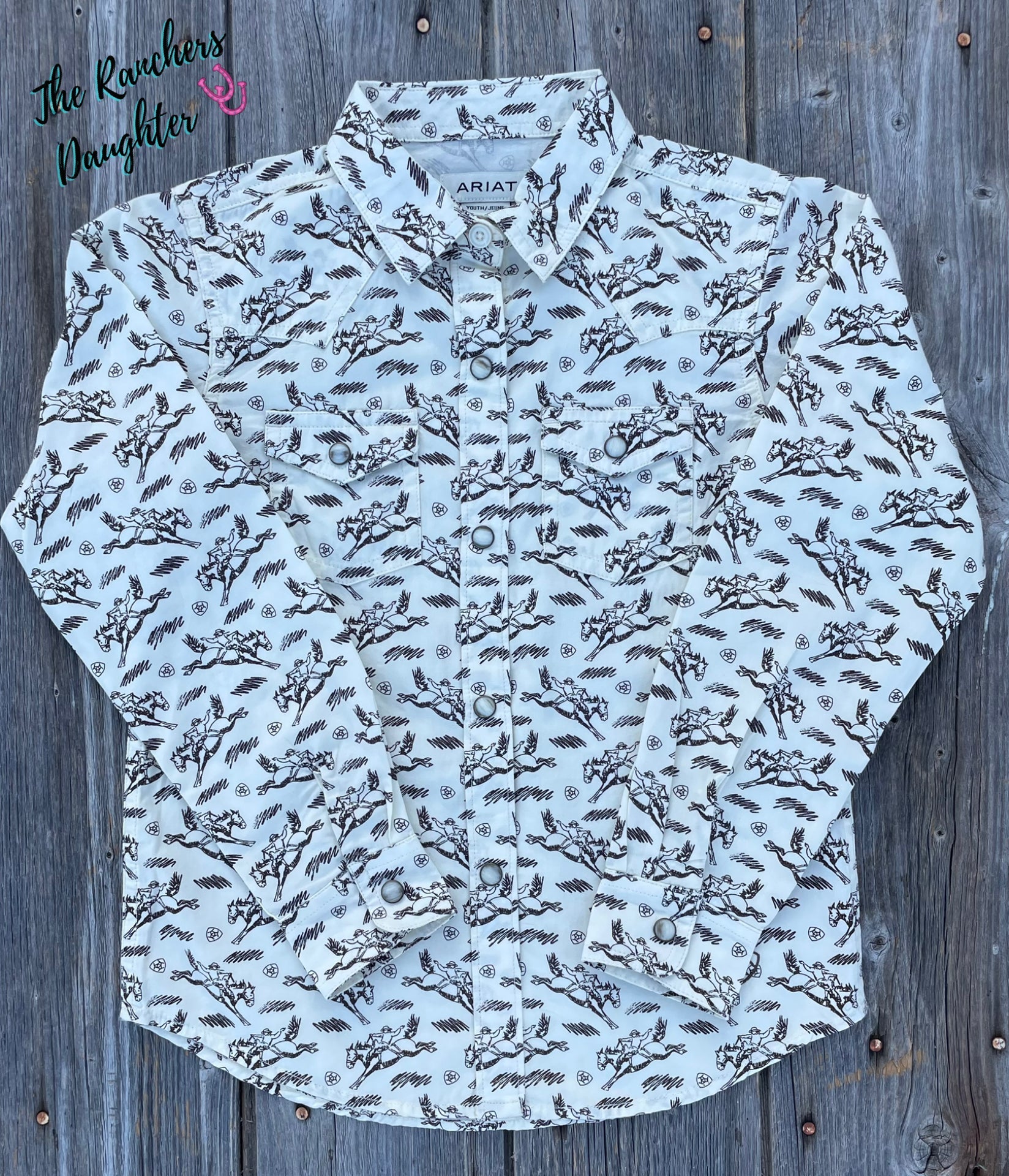 Every budding rodeo star needs a good snap shirt. This one pairs iconic Western style with a fun horsey print. She'll want to wear it from school to the barn and everywhere in between.