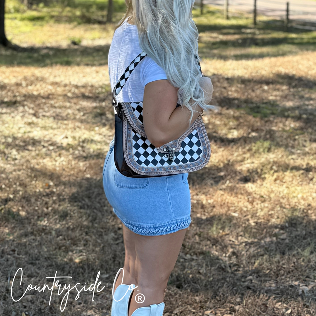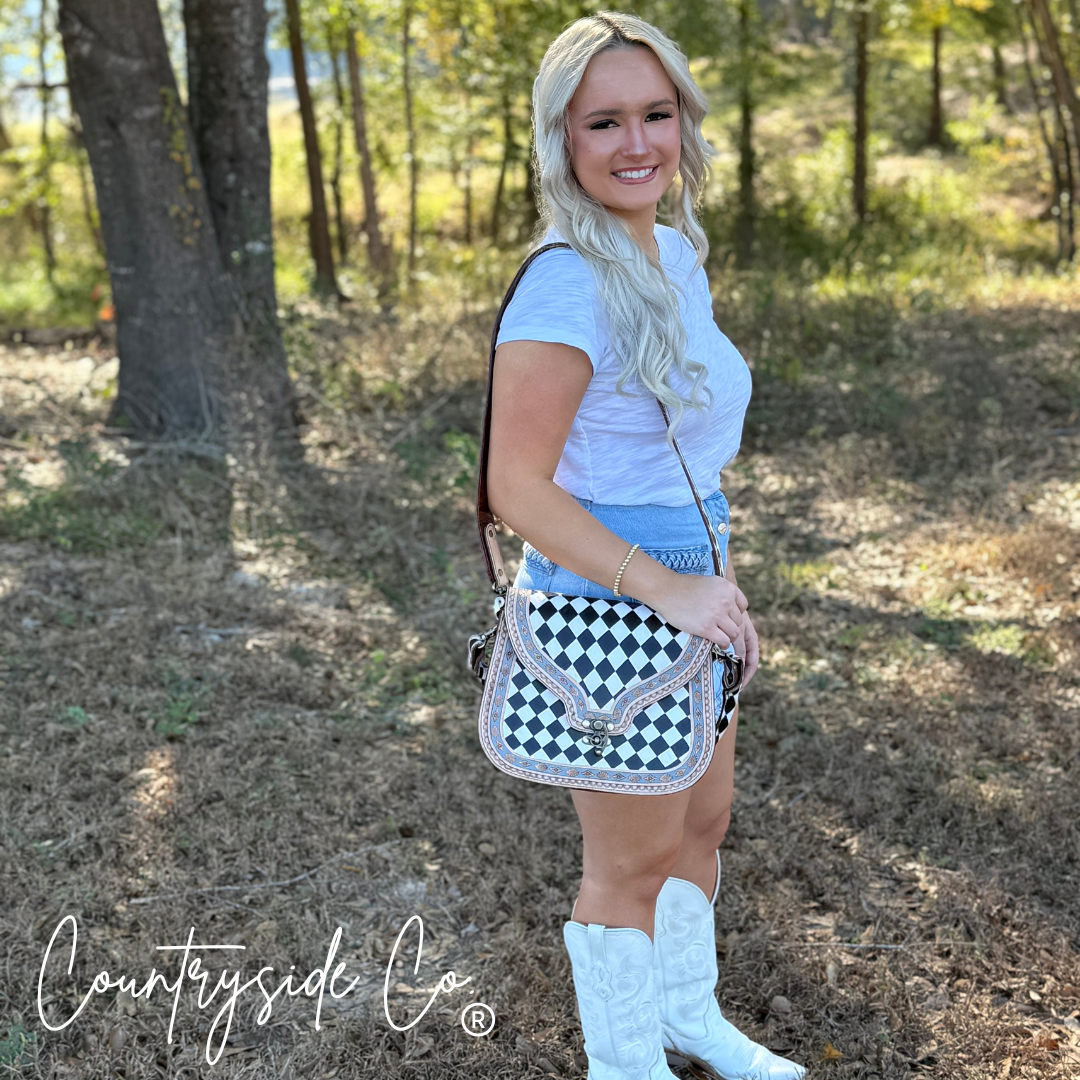 The Zadie Tooled Leather Concealed Carry Handbag presents refined functionality with artisanal details. Featuring two adjustable shoulder straps crafted from the same exquisite tooled leather as the body, this sophisticated accessory balances comfort with elegance. The distinctive antiqued latch closure adds vintage charm while ensuring security, complemented by delicate hand-painted accents that make each handbag a unique statement piece. Discreet practicality wrapped in timeless craftsmanship. These bags are hand painted so please allow for minor imperfections.